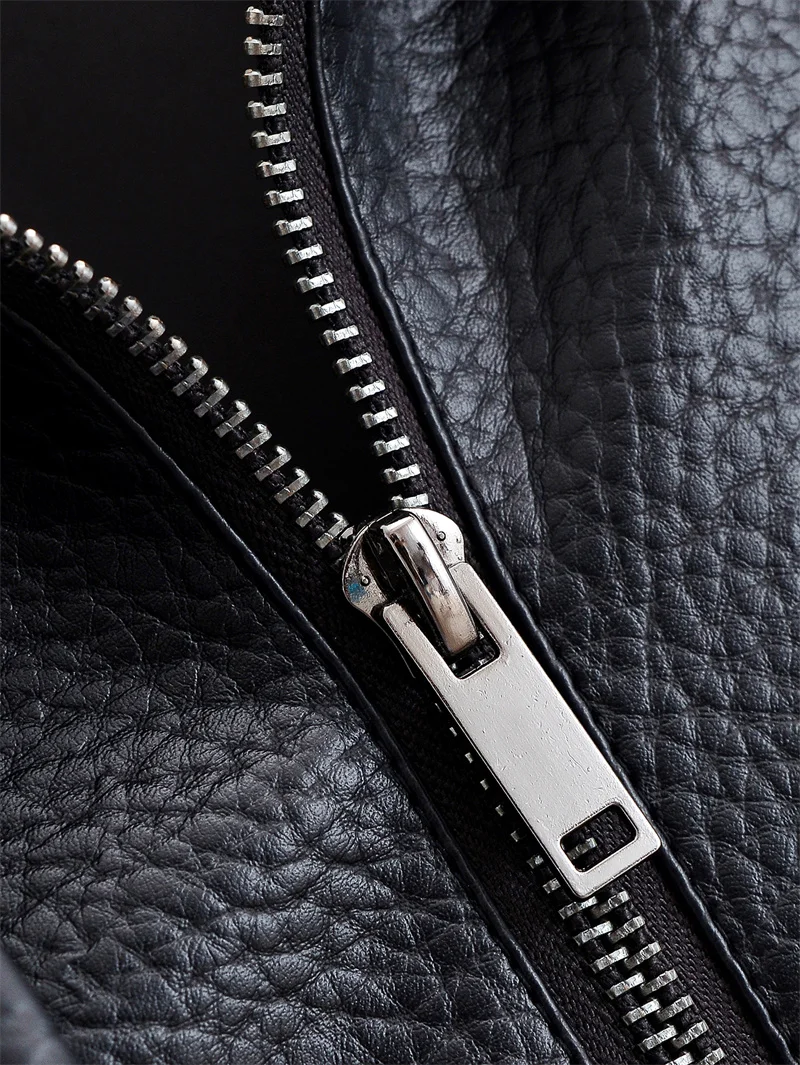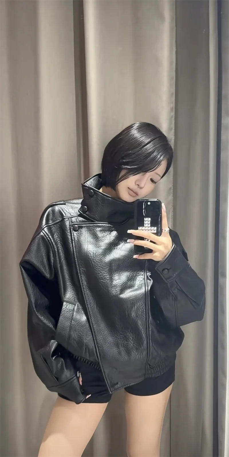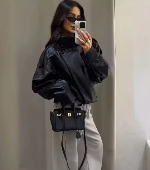 Women's Fall 2025 Black Long Sleeve Pebble Faux Leather Motorcycle Jacket